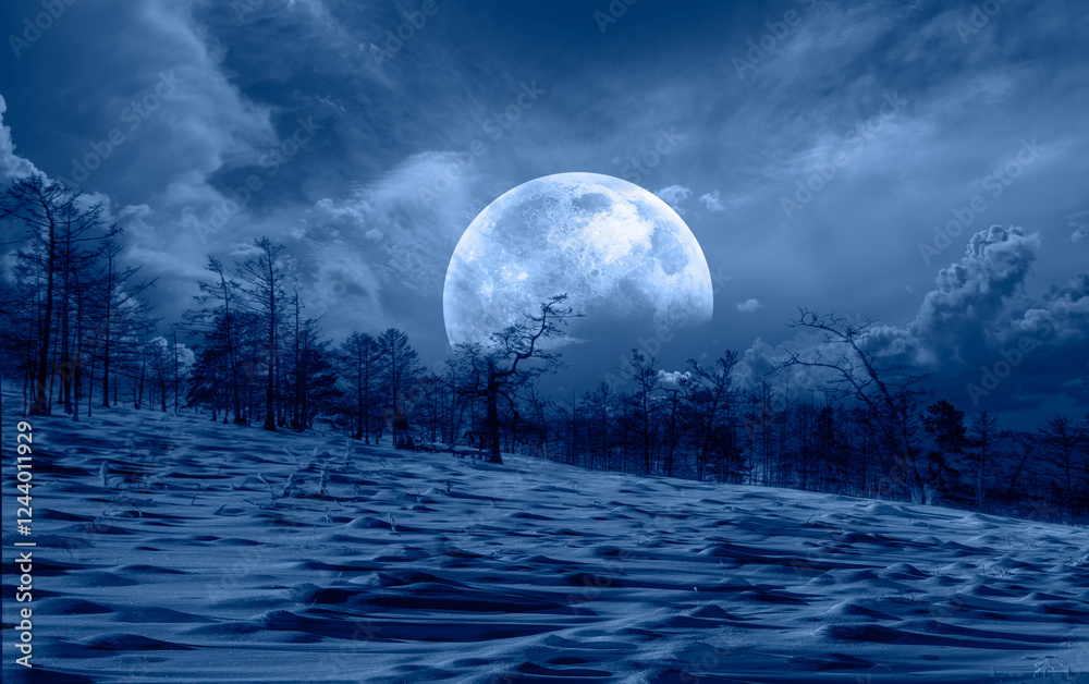 Beautiful winter landscape with dead trees and shadows on the snow and Super full moon - Baikal lake, Siberia "Elements of this image furnished by NASA "