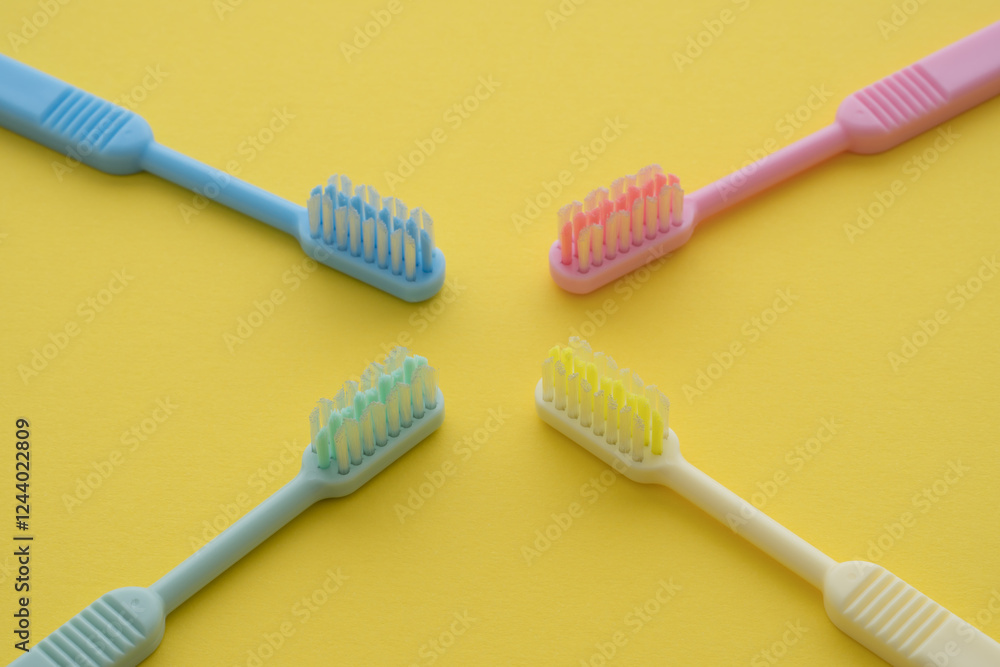 Top view of simple pastel colorful toothbrushes set on yellow background with copy space. Dental, oral care and healthcare concept.