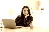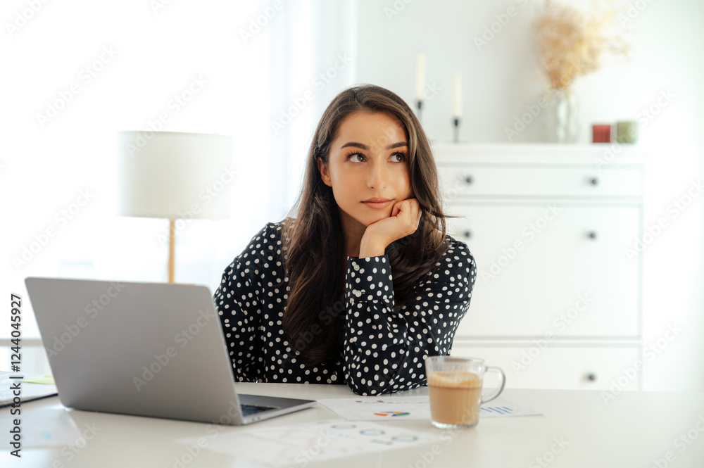 Thoughtful pretty woman sitting at a desk with a laptop and a cup of coffee, resting her head on her hand, looking away pensively, showing a relaxed and thinking mood in a bright modern office