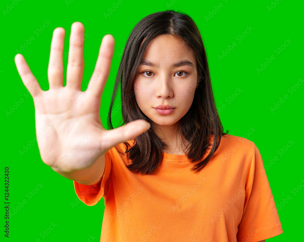 Young woman shows stop gesture with hand while wearing an orange t-shirt against a bright green background