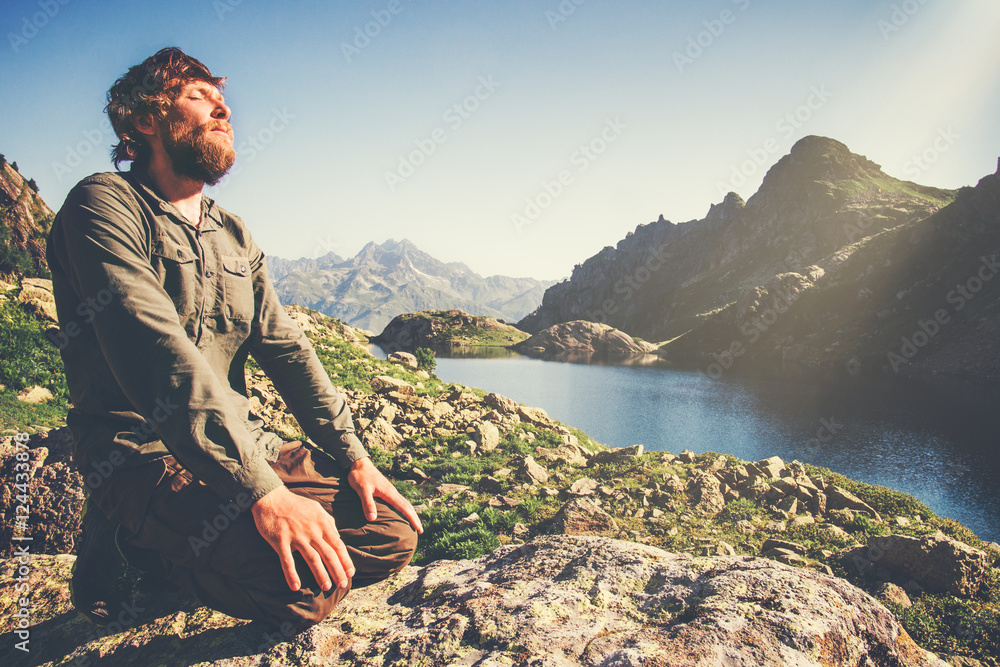 Bearded Man relaxing alone with nature Travel Lifestyle concept lake and mountains landscape on background outdoor