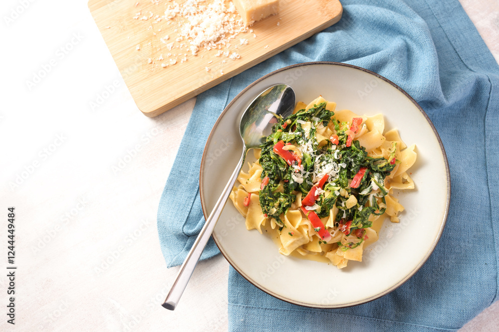 Pasta dish, tagliatelle with spinach and red bell pepper sauce, garnished with parmesan cheese in a gray plate on a blue napkin, cooking vegetarian, copy space, top view from above