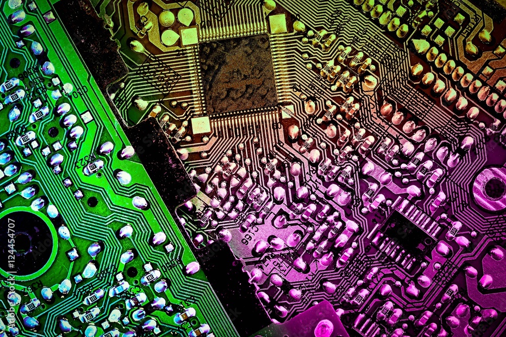 Abstract technology background computer motherboard, toned in violet yellow green colors