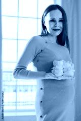 Pregnancy motherhood people expectation future. Pregnant woman with big belly holding newborn baby booties smiling at home. Young mom enjoying pregnancy. Maternity tenderness parenthood new life