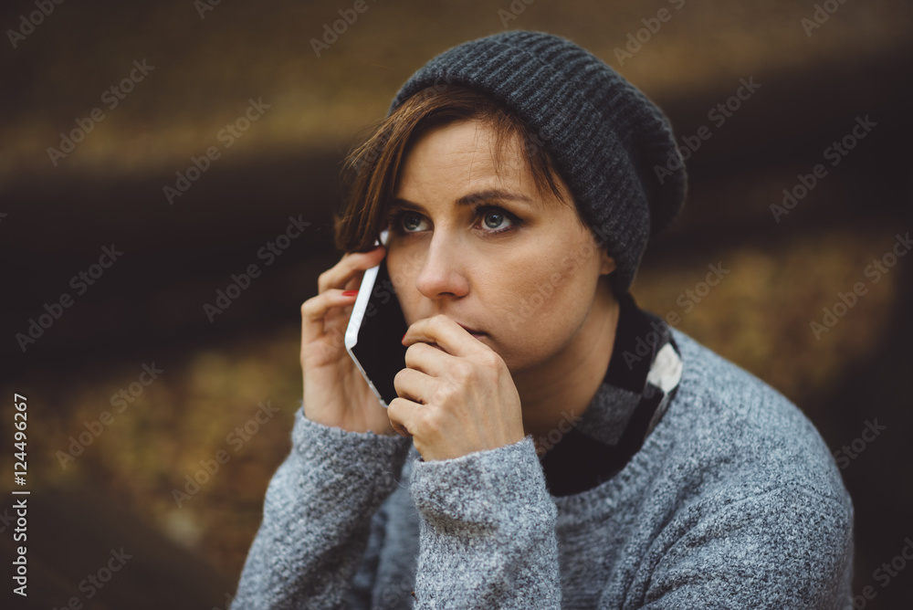Portrait of sad woman sitting alone in the forest with smartphone. Solitude concept. Millenial dealing with problems and emotions.