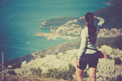 Happy hiker is standing on top of the mountain and looks into the distance. Achievement in mountains. Freedom and active life concept. Montenegro.