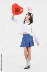 Portrait happy Asian young pretty woman wearing casual clothes bunny rabbit ears, teenager funny holding balloon heart shape color red smiling while standing pose on white background, Easter concept.