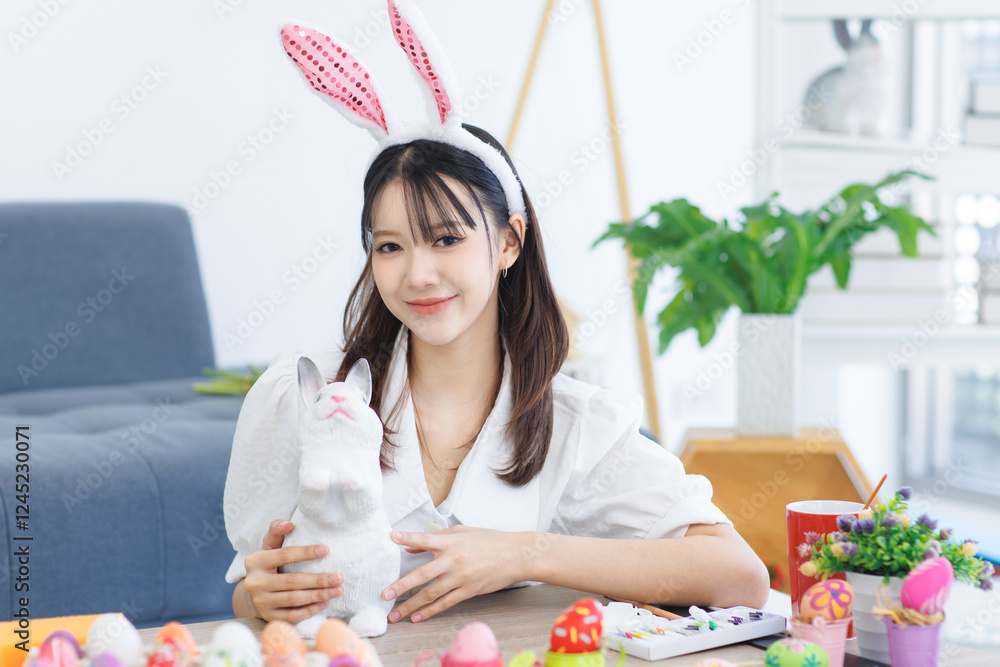 Asian beautiful attractive cheerful young cute lovely sweet woman wearing casual clothes bunny rabbit ears, happy smile look at camera at home with painted colorful eggs decorated for Easter celebrate