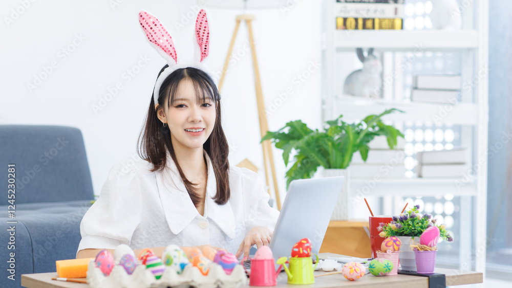 Asian beautiful attractive cheerful young cute lovely sweet woman happy funny smile using laptop computer and painting eggs sitting in the living room at home, prepare for Easter celebration concept.