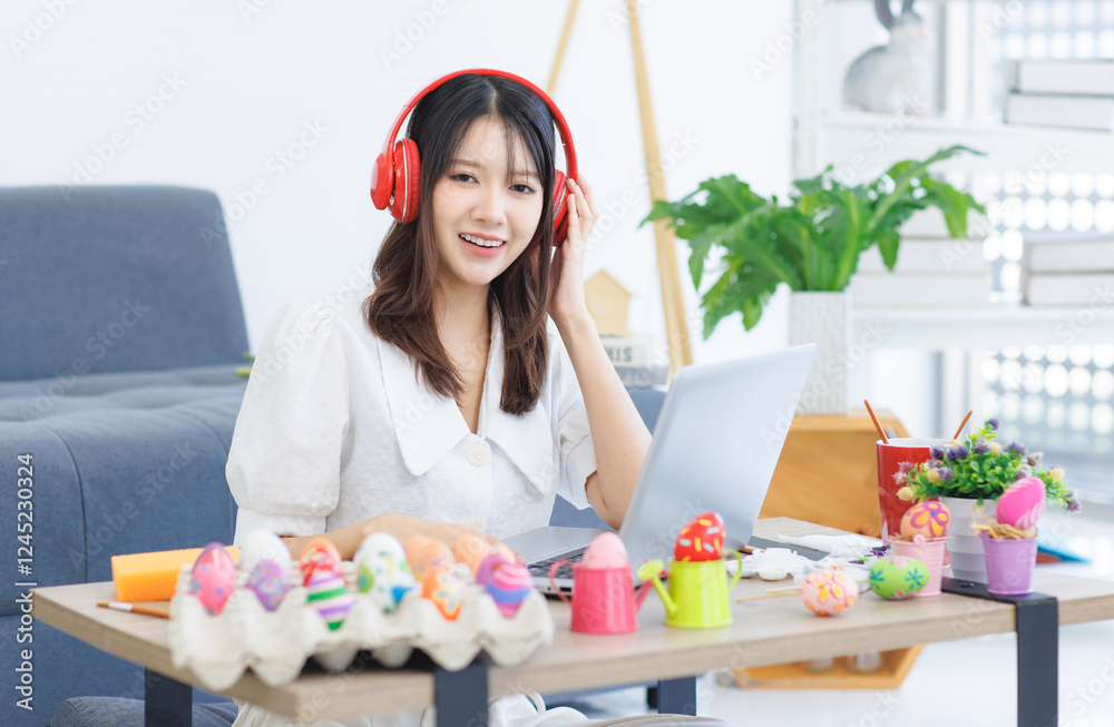 Asian beautiful attractive cheerful young cute lovely sweet woman wearing headphones listen music happy funny painting eggs sitting in the living room at home, prepare for Easter celebration concept.
