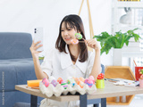 Asian beautiful attractive cheerful young cute lovely sweet woman taking selfie with mobile phone happy funny painting eggs sitting in the living room at home, prepare for Easter celebration concept.