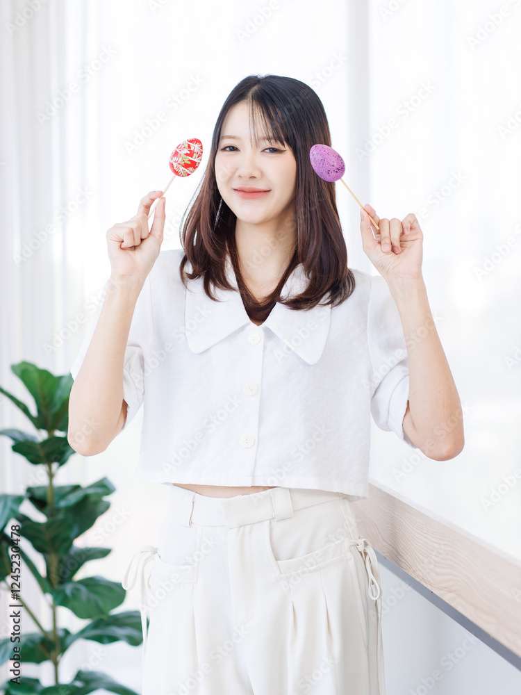 Portrait of attractive cheerful happy asian young pretty woman wearing casual clothes teenager smiling funny holding colorful easter egg pose looking at camera in living room at home Celebrate concept