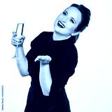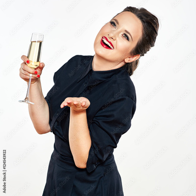 young woman in evening black dress hold wine glass. female model