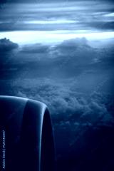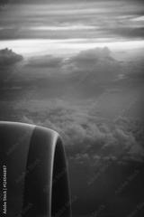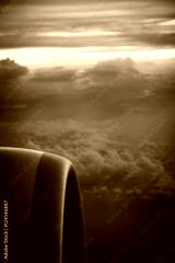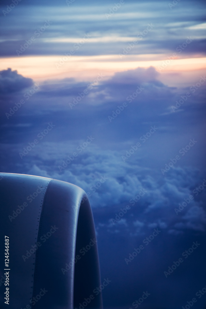 Airplane engine view from window with beautiful sky at sunrise during flight