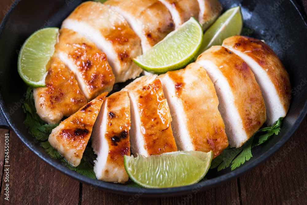Sliced grilled chicken breasts with lime and parsley on dark wooden background close up. Healthy food.