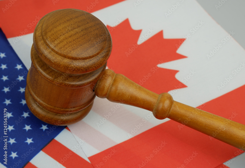 Regulations between the United States and Canada. Gavel on flags of USA and Canada.