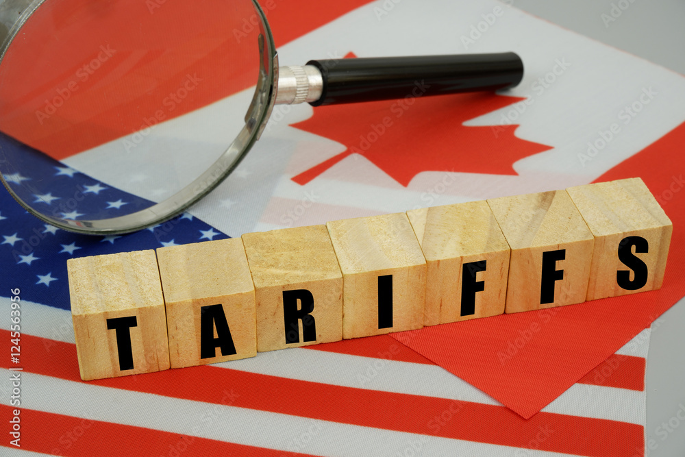 Tariffs between the United States and Canada. USA and Canadian flags, magnifying glass and wooden cubes with word tariffs.