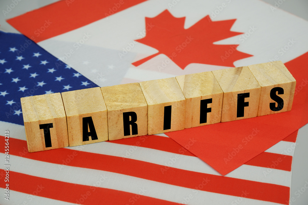 Tariffs between the United States and Canada. USA and Canadian flags and wooden cubes with word tariffs close up.