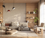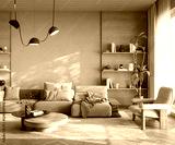 A stylish, inviting interior with warm neutral tones, sleek contemporary furniture and wooden shelving, 3d rendering