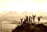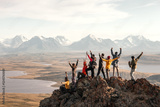 Large group of tourists diverse people hikers are standing at mountain top at winner poses with open raised arms and enjoys achievement