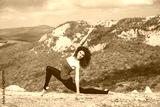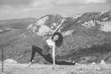 Girl doing stretching in mountains landscape