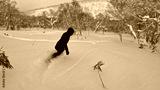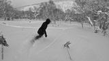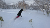 Unrecognizable athletic woman in black and dark red gear snowboards off piste after a blizzard. Active female tourist shreds deep powder snow in the backcountry of Rusutsu during a heavy snowstorm.