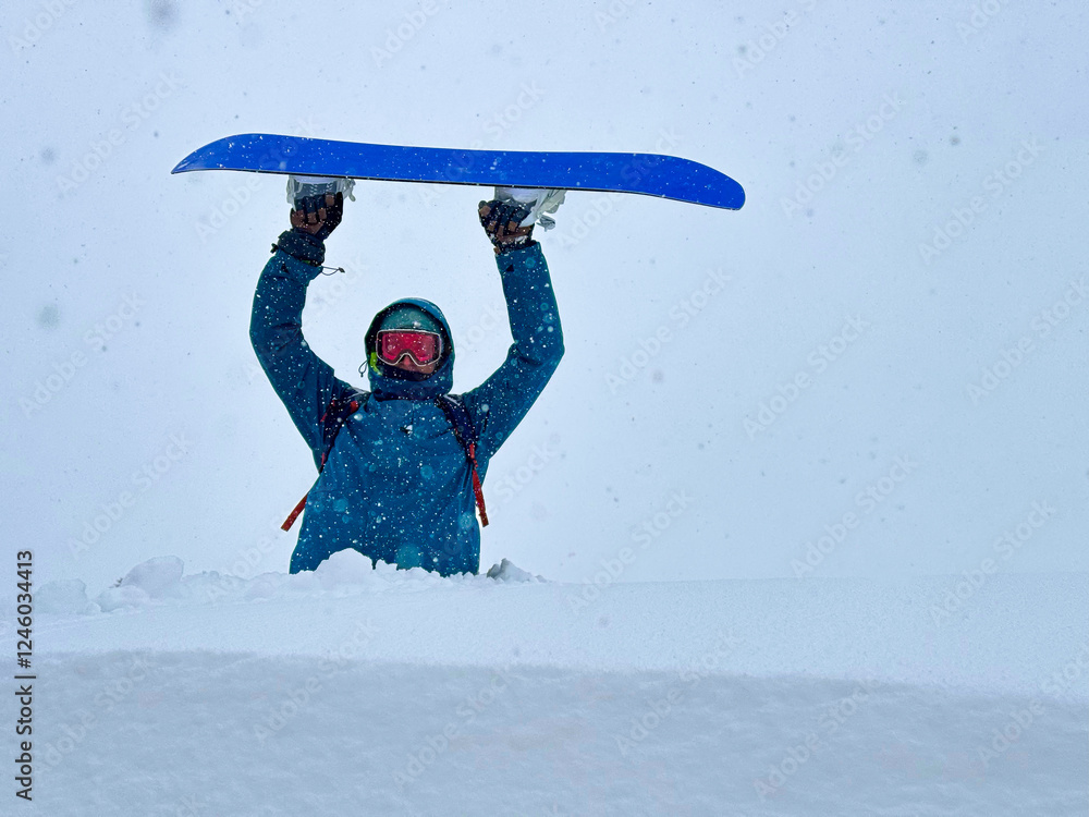 Happy man on snowboarding trip celebrates blizzard bringing fresh snow. Cheerful snowboarder in blue jacket lifts snowboard above head, celebrating a fun snowboarding trip in the mountains of Japan.