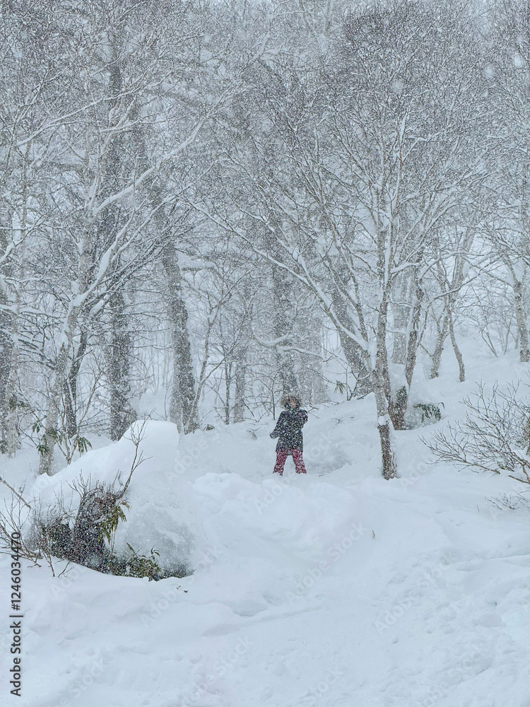 Unrecognizable young woman snowboarding offpiste during a snowstorm stops to rest and observe the snowy forest. Experienced female snowboarder stops to observe the wilderness engulfed in blizzard.