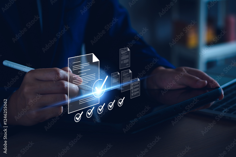 Checklist business performance monitoring concept, Businessman online survey filling out check digital form task, online survey question form, target marketing planning with quality control