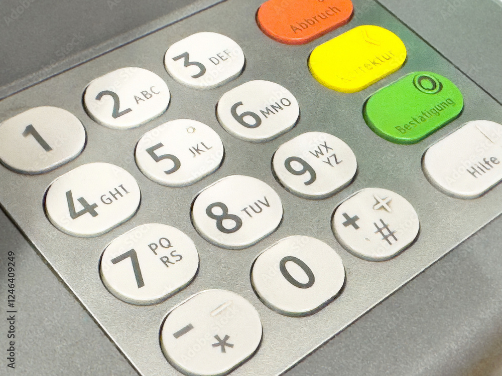Close-up of atm keypad with multilingual buttons
