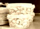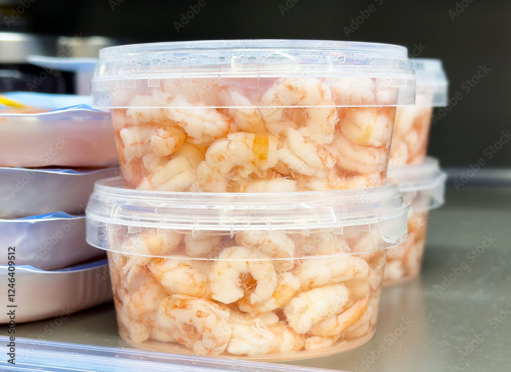 Fresh peeled shrimp in plastic containers stacked in refrigerator display