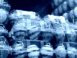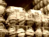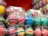 Colorful striped plastic balls in transparent packaging displayed on shelf