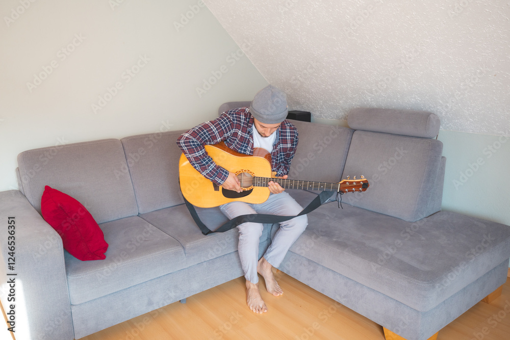 Barefoot musician sits comfortably on a gray couch, strumming an acoustic guitar in a cozy, relaxed atmosphere, lost in the soothing melodies and deep emotional connection to music