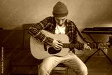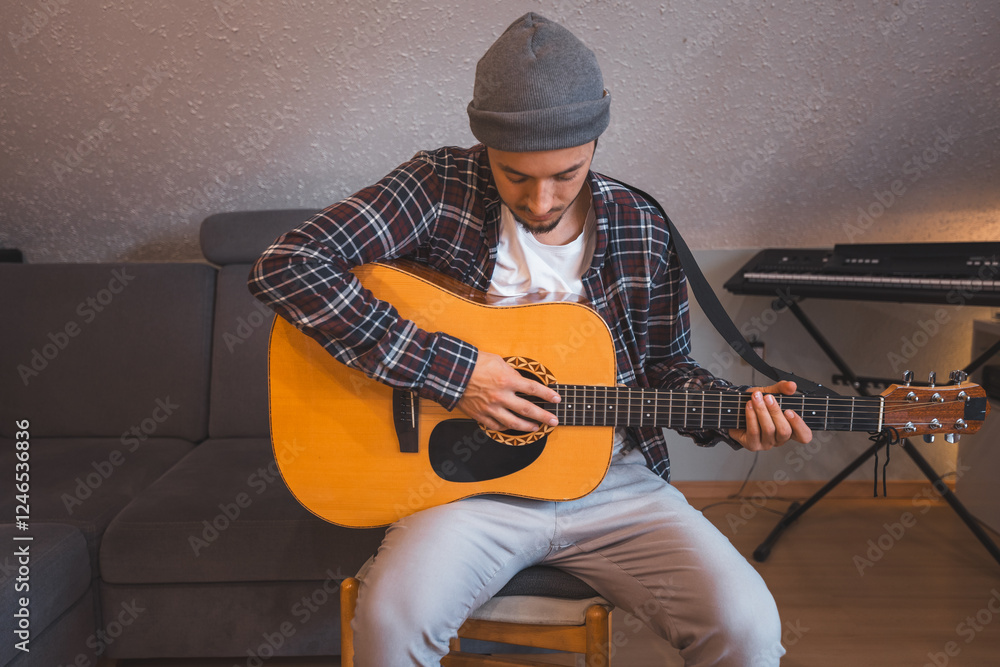 Barefoot musician sits on a wooden chair, fully immersed in playing an acoustic guitar, lost in the music, creating a warm and intimate atmosphere in a cozy home studio