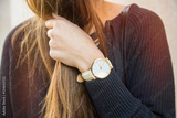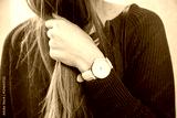fall fashion details, young business woman holding her golden watch. graded in warm colors.