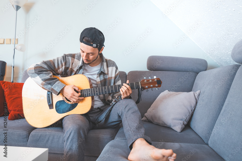 Young man with a relaxed demeanor sits barefoot on a cozy blue couch, strumming an acoustic guitar. His expression shows contentment and focus as he connects with his music. Casual and creative vibe