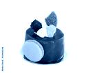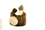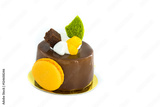Beautiful chocolate cake with macaroon on the side, siting on golden plate. Green mint cream on top. White background, studio isolated.