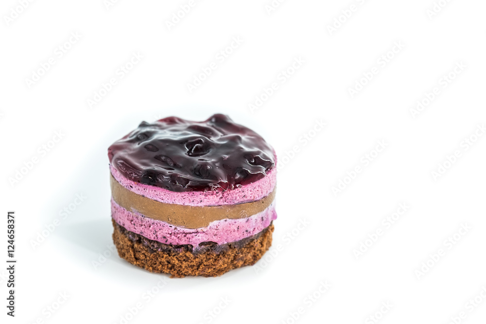 Layered cake with forrest fruits jelly on top isolated on white background.