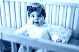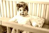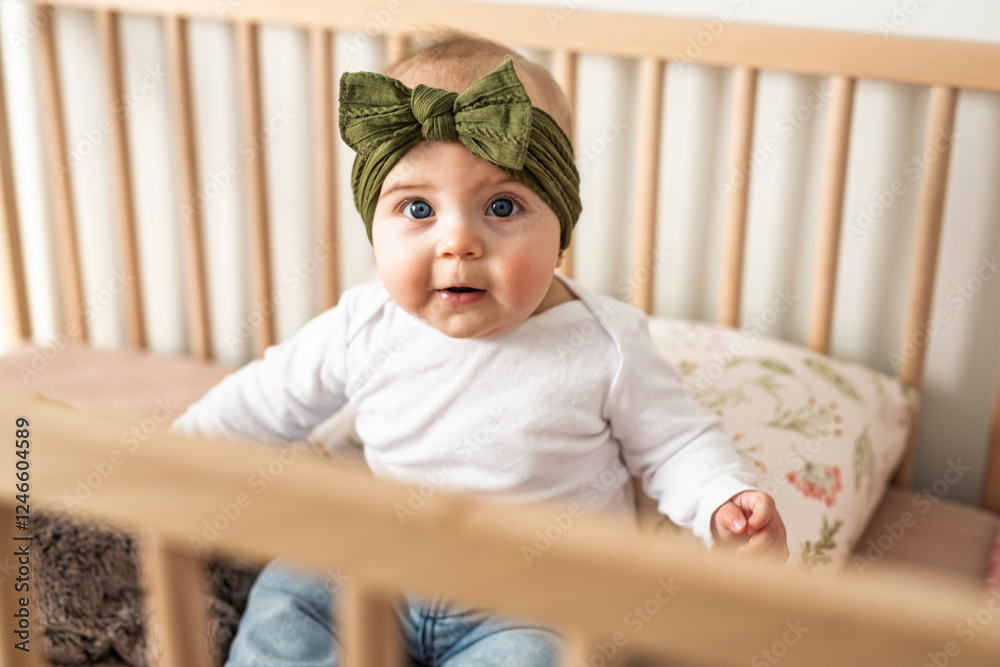 Portrait of baby standing in crib. Baby girl stand alone in crib