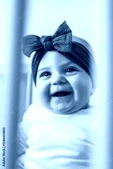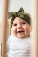 Portrait of baby standing in crib. Baby girl stand alone in crib