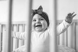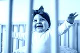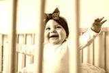 Portrait of baby standing in crib. Baby girl stand alone in crib