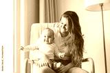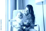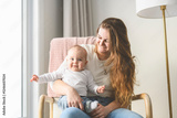 Cute small baby girl in bed at home. Woman holding little infant child.