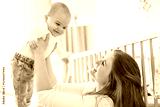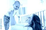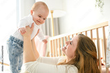 Cute small baby girl in bed at home. Woman holding little infant child.