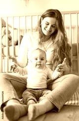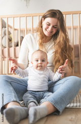Cute small baby girl in bed at home. Woman holding little infant child.
