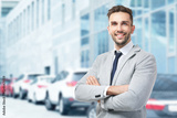 Young businessman on blurred car salon background. Car sale and rent concept.