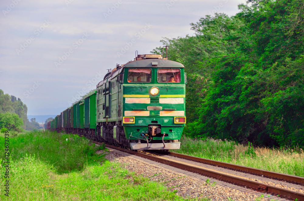 Cargo freight train among the green nature