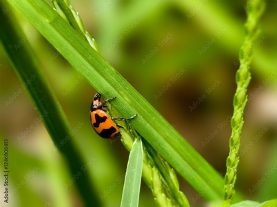 Ladybug or Coelophora inaqualis perched on a grass leaf. Macro photography