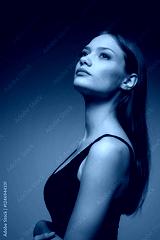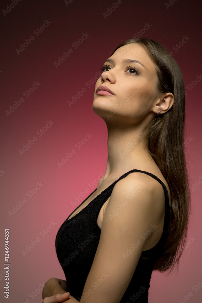 Dramatic upward angle portrait with pink gradient background. Model's confident pose and elegant profile create powerful fashion aesthetic