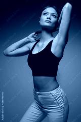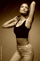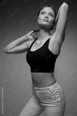 Dynamic fashion portrait with dramatic pose against pink gradient background. Model in black top and white pants creates elegant, dance-inspired movement.