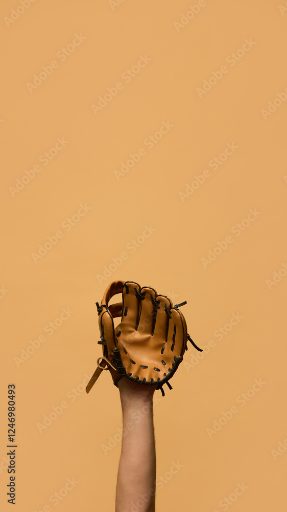 Hand wearing leather baseball glove, holding ball securely, representing protection and skill in catching against warm-toned background. Concept of sport equipment, control, strategy, game. Ad